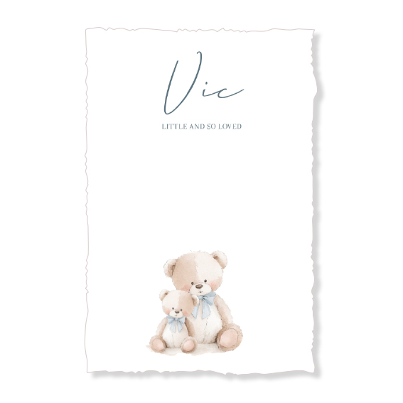 Handgeschept papier-look geboortekaartje voor een jongen met twee beertjes. Perfect voor een broertje. Je kan het geboortekaartje zelf aanpassen en een beertje verwijderen als het jullie eerste kindje is. Eenvoudig en bijzonder te combineren met een blauw zijden lint. Elk geboortekaartje is uniek doordat je zelf met een speciaal liniaal de randen scheurt voor de handgeschepte look. Lees de onderstaande tips om het beste resultaat te bereiken. Het zijden lint kan je los bestellen en zelf de strik maken.