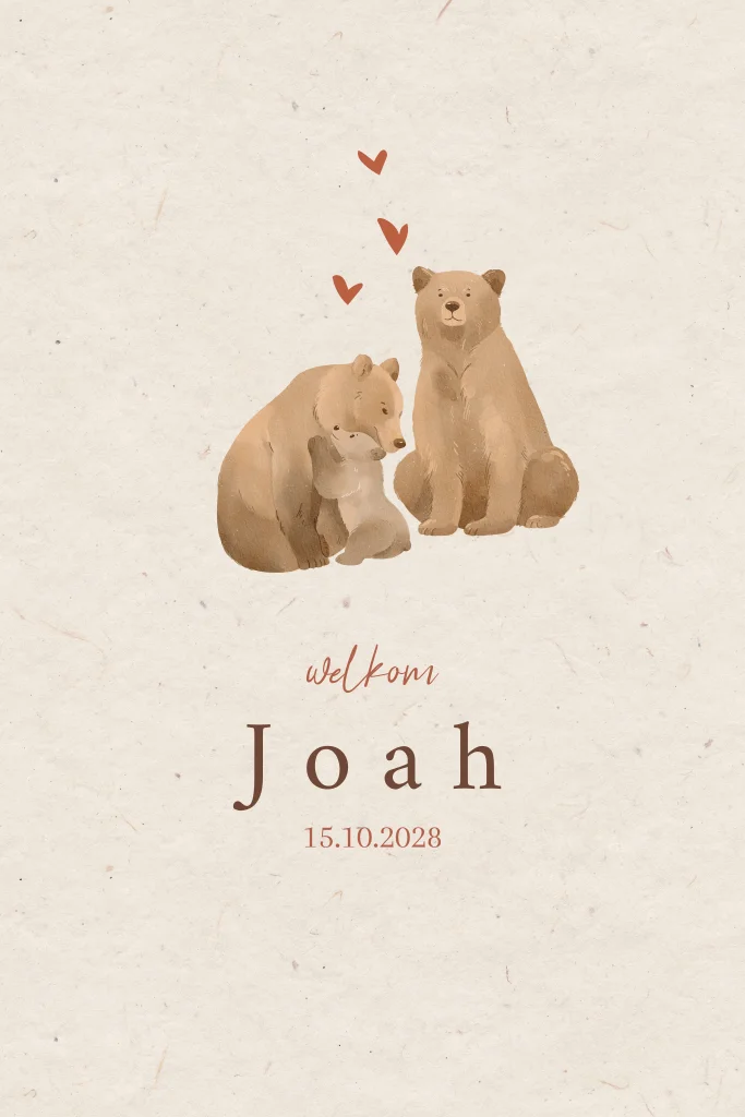 Dieren geboortekaartje voor een jongen met een beren familie. Het beertje geeft dit geboortekaartje een hele lieve en tegelijk stoere uitstraling. Je kan eenvoudig de teksten en de kleuren op het kaartje zelf aanpassen. Mooi met bijpassend raambord en een sluitzegel