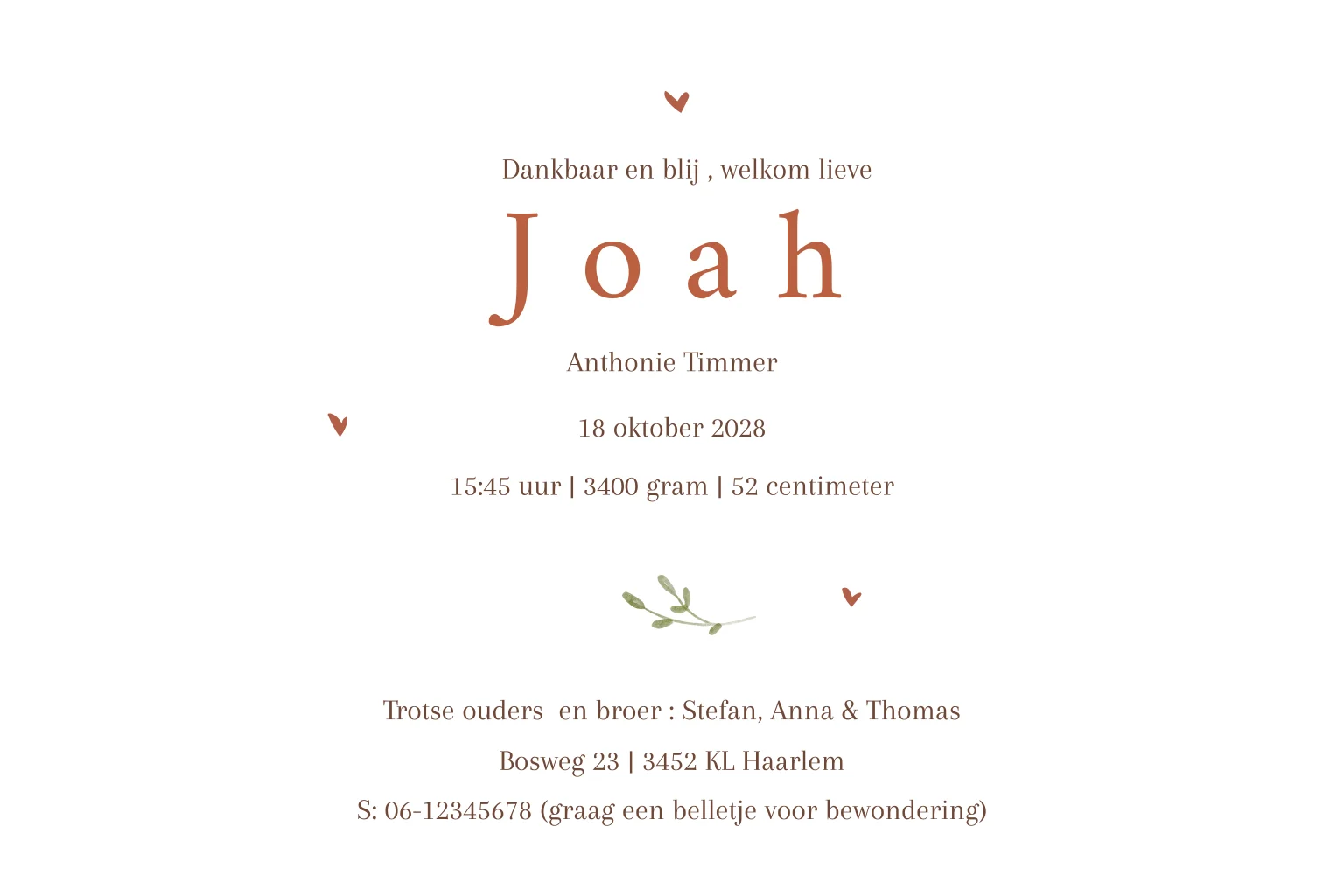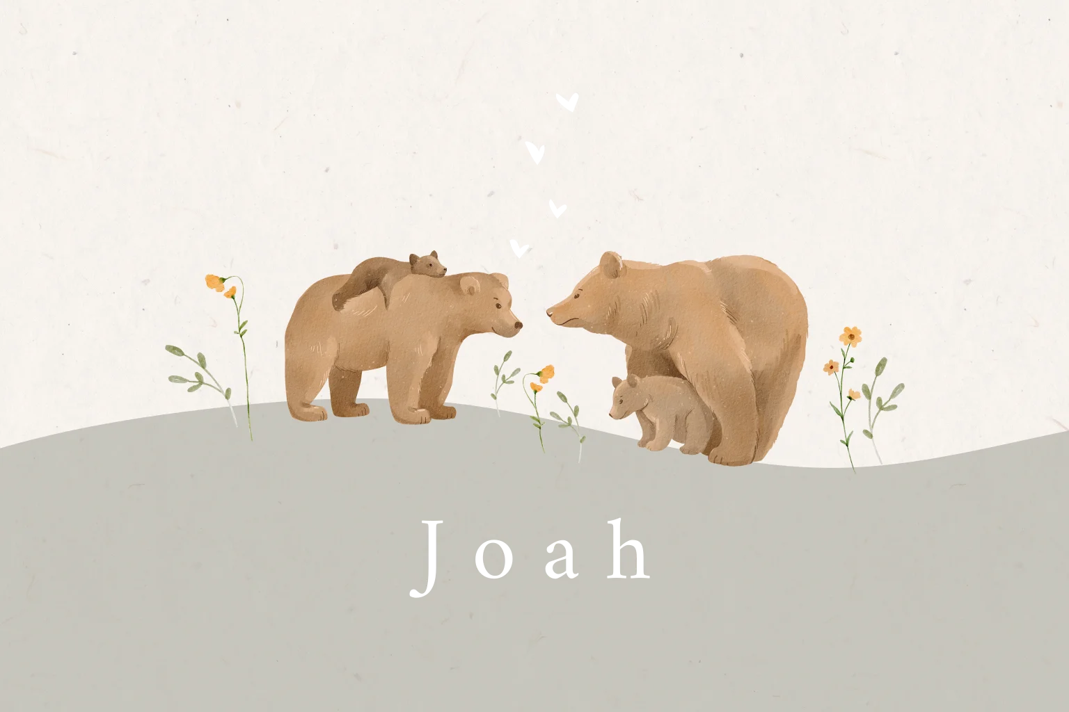 Stoer geboortekaartje voor een jongen met een broertje of zusje. De familie beer maakt het geboortekaartje heel persoonlijk. In de beeldbank staan meer beren om het ontwerp mee aan te passen naar wens. Mooi met koperfolie details. De binnenkant is eenvoudig gehouden met hartjes en een origineel gedichtje.