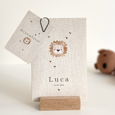 Origineel geboortekaartje voor een jongen met een leeuw. Minimalistisch en neutraal door de linnen achtergrond. Stoer kaartje voor een zoon. Alle details en de achtergrond kleur zijn eenvoudig zelf aan te passen met de online editor. Maak de geboorte aankondiging extra feestelijk met een sluitzegel op maat, raambord in de stijl van het geboortekaartje. Voor een kraamfeest kan een bijpassend kaartje worden bevestigd met een leuke papierclip, waardoor het geheel een persoonlijke en feestelijke touch krijgt.
