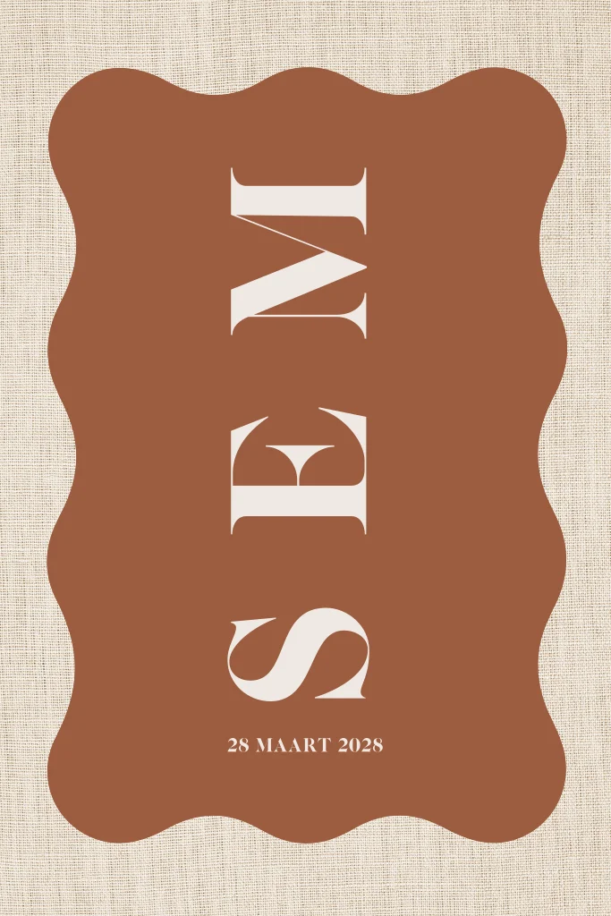 Minimalistisch stoer geboortekaartje voor een jongen met een golfvorm op een linnen achtergrond. De naam en details zijn eenvoudig om te zetten naar goudfolie of een andere kleur. Verrassend effect met de naam verticaal op de voorkant. Leuk om voor een mooie trendkleur te kiezen als golfvorm op de voorkant !
