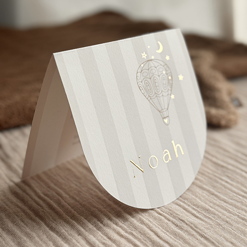 Trend geboortekaartje voor een jongen met luchtballon en streepjes. Het geboortekaartje heeft een ronde staande vorm die een luxe uitstraling geeft aan dit ontwerp. Je kan de kleuren van het kaartje zelf aanpassen. liever geen streepjes ? Die kan je eenvoudig wegklikken.