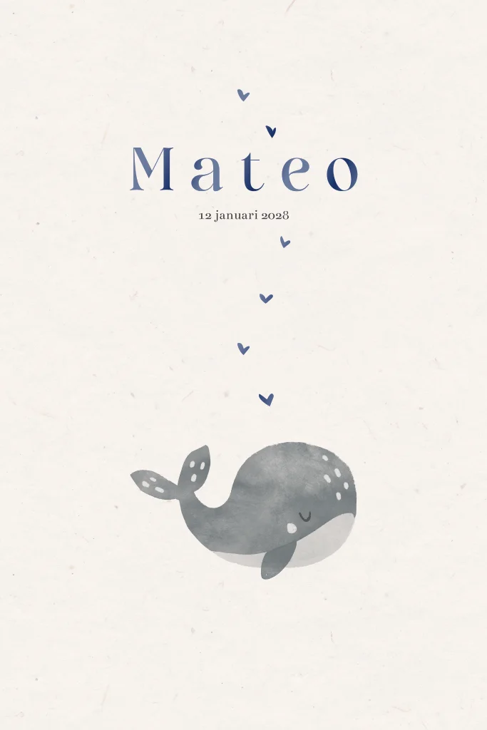 Geboortekaartje jongen walvis hoogglans hartjes