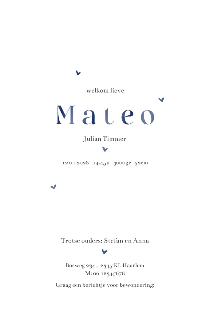Lief geboortekaartje voor een jongen met een waterverf walvis en hartjes. Een mooi geboortegedichtje op de binnenkant. De hoogglans folie kleur en de teksten en kleuren kan je aanpassen in de online editor. Leuk met een bijpassende sluitzegel en raambord !
