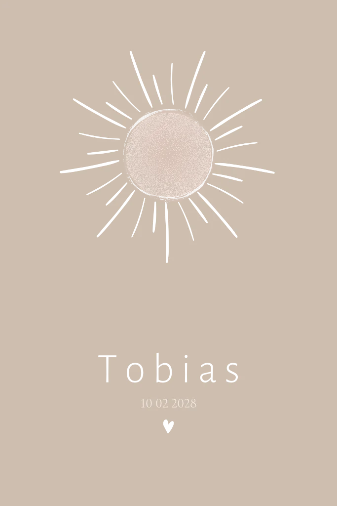 Eenvoudig neutraal geboortekaartje voor een jongen met goudfolie zon en een beige trendkleur als achtergrond. Ook mooi voor een meisje , je kan zelf de details aanpassen in de editor.