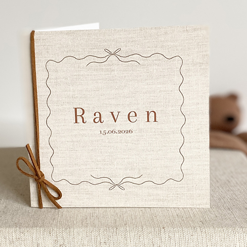 Minimalistisch geboortekaartje voor een jongen met een trend strik en linnen achtergrond. Je kan zelf de details en bijvoorbeeld goudfolie online aanpassen in de ontwerptool en met illustraties uit de mappen. Bestel een raambord in de stijl van het geboortekaartje en versier de envelop met een sluitzegel