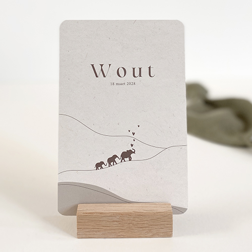 Stoer geboortekaartje met olifant familie voor een jongen in neutrale kleuren . Met een vezellook achtergrond. Een geboortekaartje met dieren voor een zoon in stoere aardetinten. je kan zelf eenvoudig het geboortekaartje aanpassen.