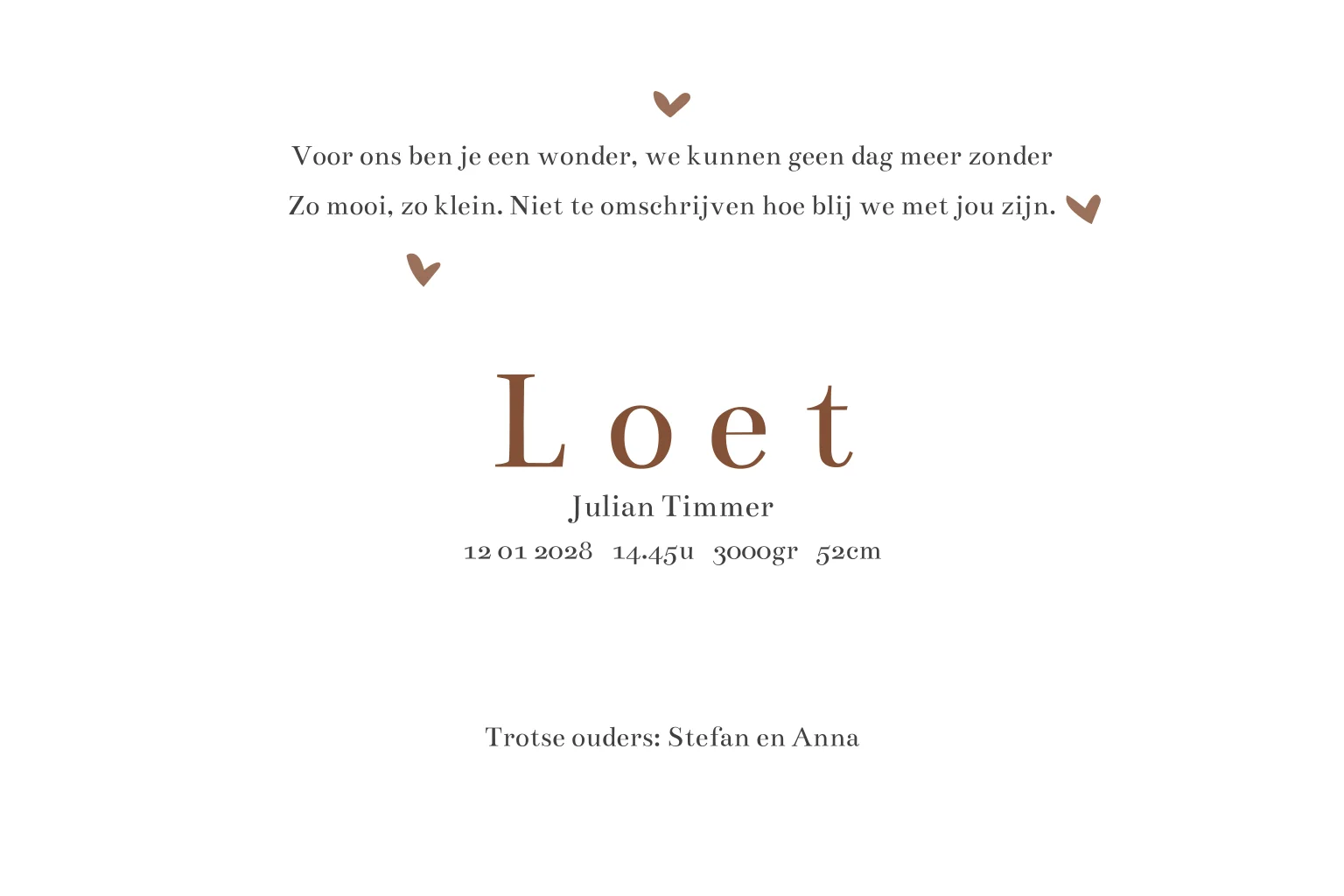 Lief geboortekaartje voor een jongen met een waterverf olifant en hartjes. Een mooi geboortegedichtje op de binnenkant. Het ontwerp is neutraal en kan ook voor een meisje worden besteld. Pas eenvoudig de teksten en kleuren aan in de online editor. Leuk met een bijpassende sluitzegel.