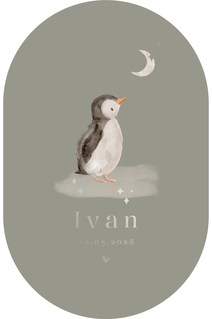 Lief geboortekaartje met een pinguïn en maan voor een jongen. Met zilverfolie sterretjes en babynaam. De achtergrondkleur groen kan je aanpassen naar een andere neutrale kleur. De pinguïn zie je al veel in de babykamer trend voor 2026. Met een ander achtergrondkleur is het ontwerp ook heel mooi voor een meisje.