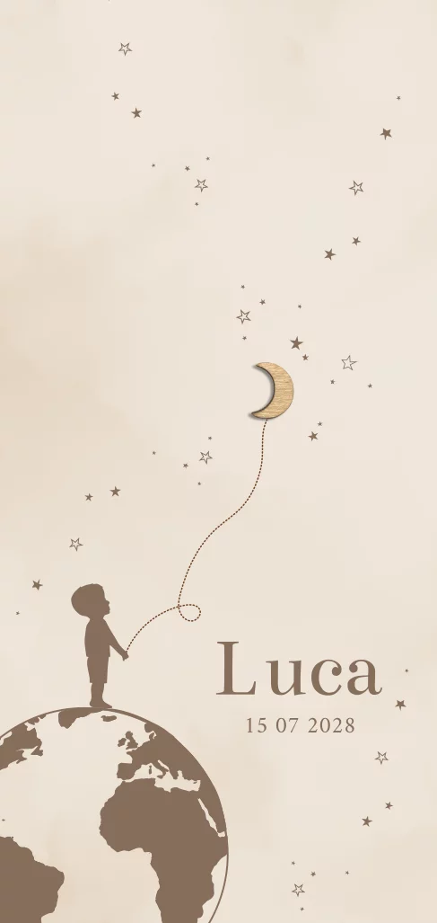 Origineel geboortekaartje met het silhouet van een jongen op de wereldbol. Met slinger en echt houten maantje. Broertje of zusje erbij ? Alle silhouetjes staan in de beeldbank. Let op: het maantje wordt niet afgedrukt ! Je kan een proefzakje met houten elementjes bij de proefdruk bestellen zodat je het resultaat in het echt kan bewonderen.