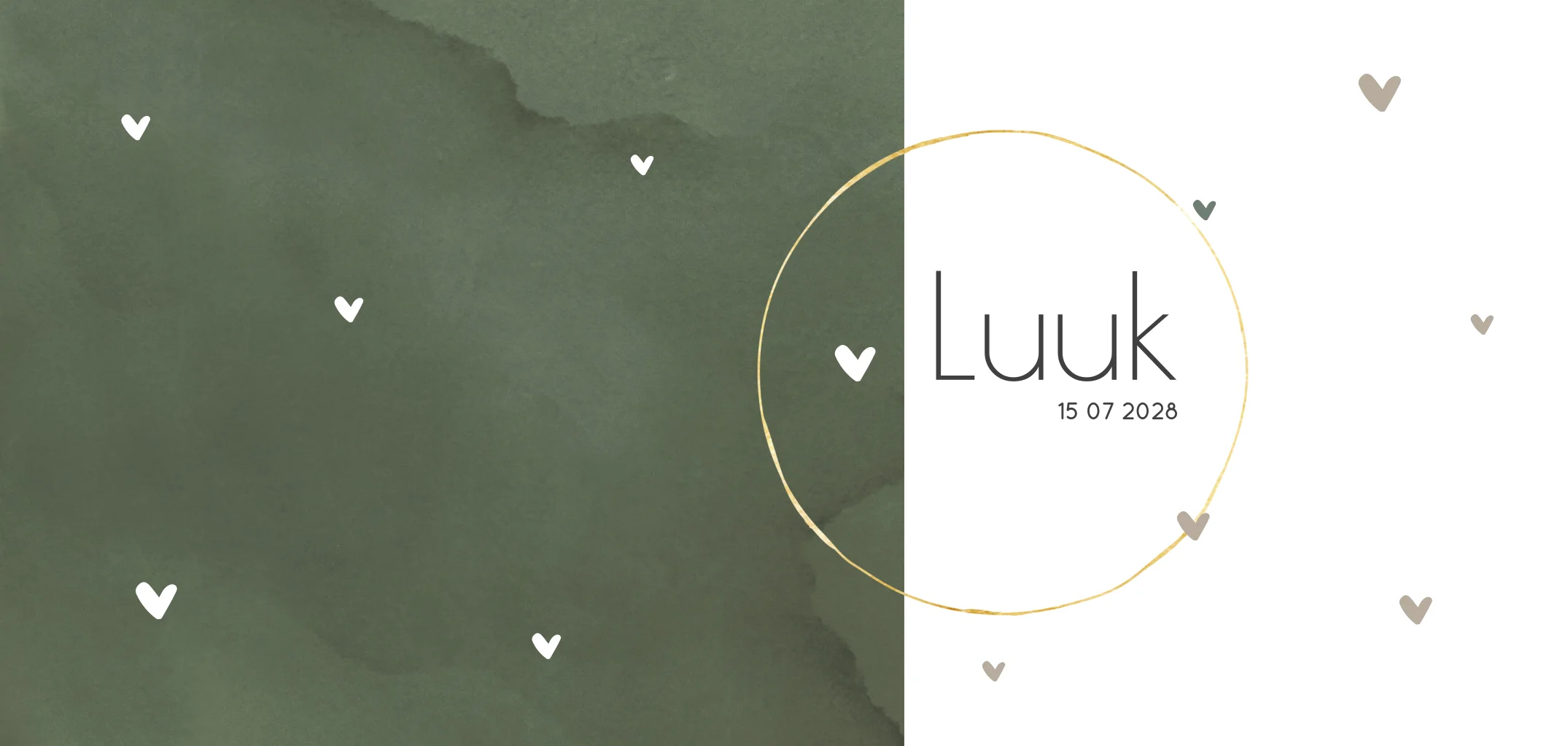 Geboortekaartje met goudkleur naamcirkel. Stoer waterverf groen en clean met een paar subtiele hartjes. Het ontwerp is heel geschikt om te combineren met een babyfoto van jullie zoon.