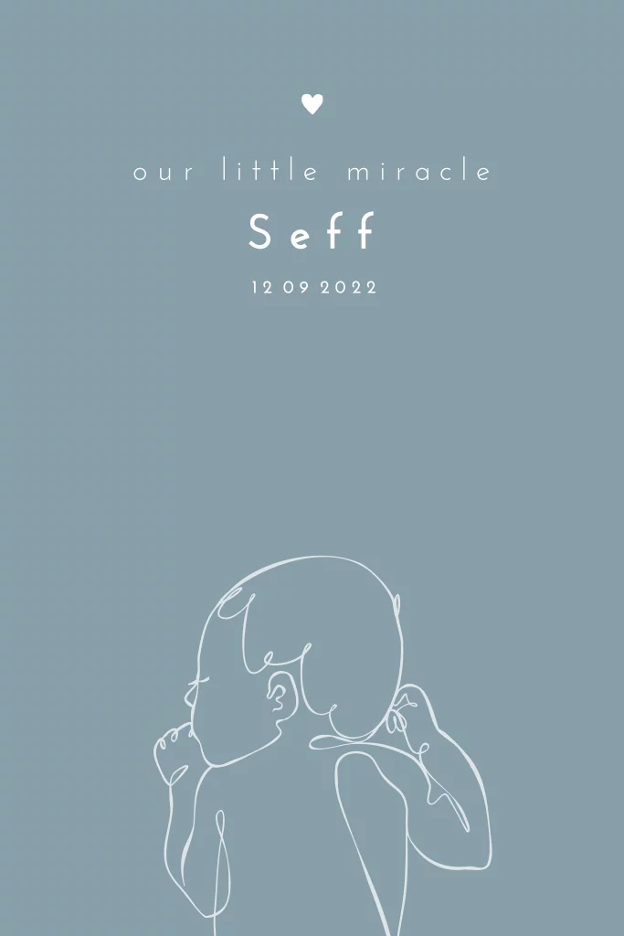 Lief, tijdloos en hip geboortekaartje met een baby lijntekening. De rest van het ontwerp is clean en minimal voor een maximale uitstraling:) Met mooie vergrijsde blauwtint, die je zelf kan aanpassen.