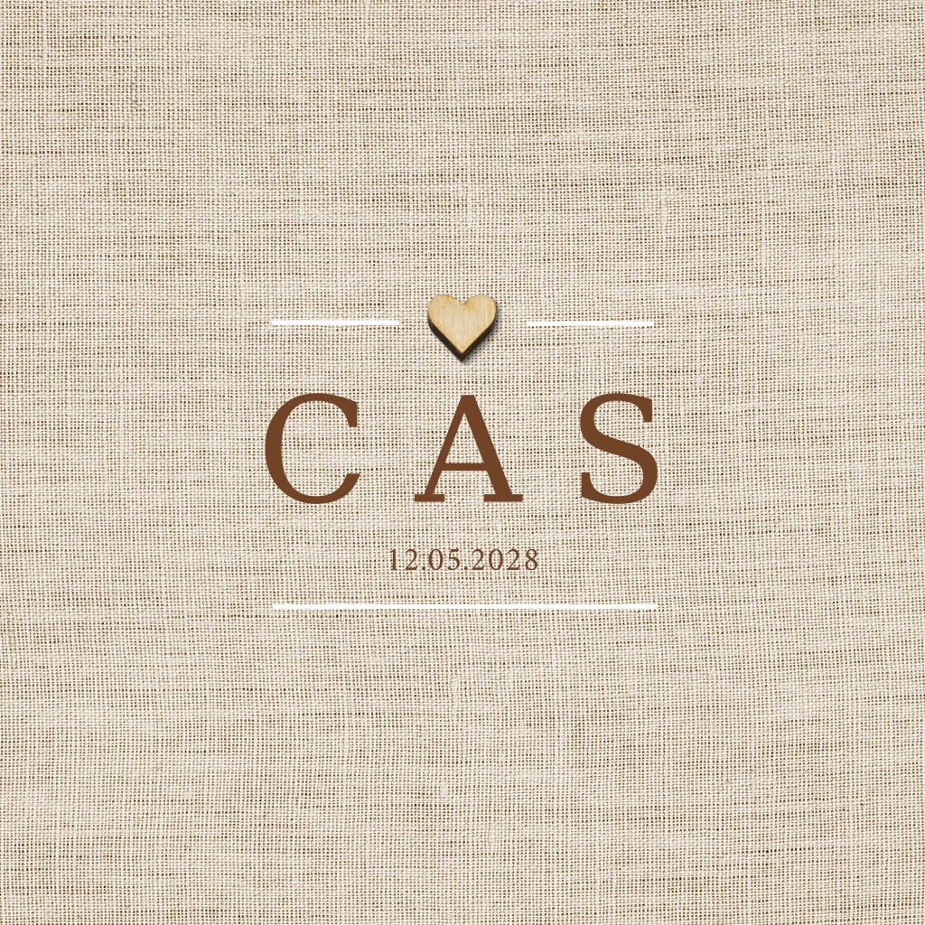 Klassiek geboortekaartje voor een jongen met een echt houten hartje en een linnen achtergrond. De naam van jullie zoon staat in het middelpunt. Tijdloos ontwerp. Je kan eenvoudig de tekst en het lettertype aanpassen.