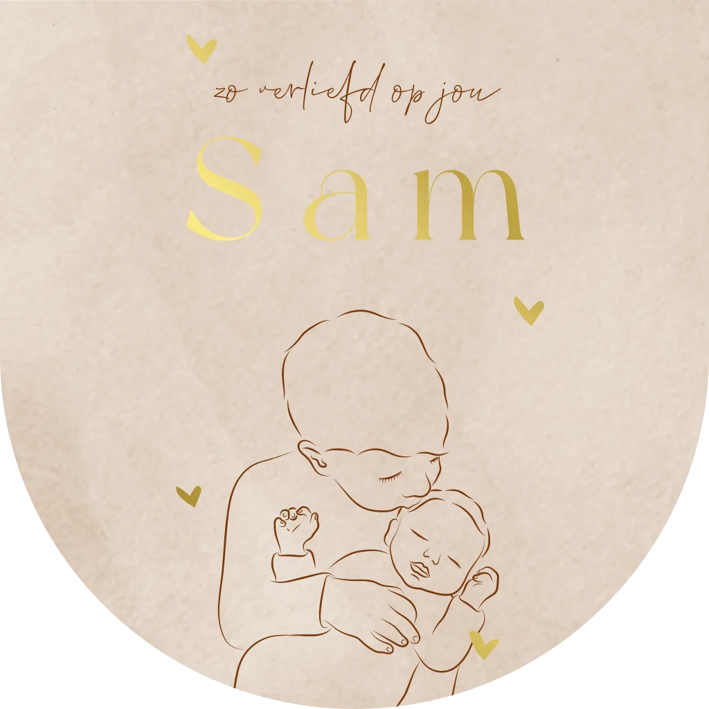 Origineel neutraal geboortekaartje voor een jongen met mooie lijntekening van een broertje met de baby. Het geboortekaartje heeft een ronde staande vorm die een luxe uitstraling geeft aan dit ontwerp. Mooi met de goudfolie details zoals de babynaam en de hartjes.op de binnenkant staat een gedichtje en een ooievaar. Bestel van te voren een proefdruk zodat je het geboortekaartje in het echt kan bewonderen. Alle kleuren zijn eenvoudig naar wens aan te passen.