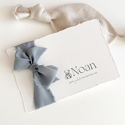 Handgeschept papier-look geboortekaartje voor een jongen met een beertje en een zijden lint strik in de kleur blauw. Klassiek met een luxe uitstraling. Elk geboortekaartje is uniek doordat je zelf met een speciaal liniaal de randen scheurt voor de handgeschepte look. Lees de onderstaande tips om het beste resultaat te bereiken. Je kan het zijden lint los bestellen