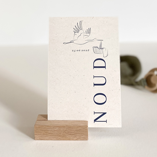 Neutraal geboortekaartje voor een jongen met een lijntekening ooievaar. De naam is stoer en minimalistisch op dit geboortekaartje met een vezel achtergrond. je kan zelf eenvoudig de details aanpassen met de online ontwerp tool.