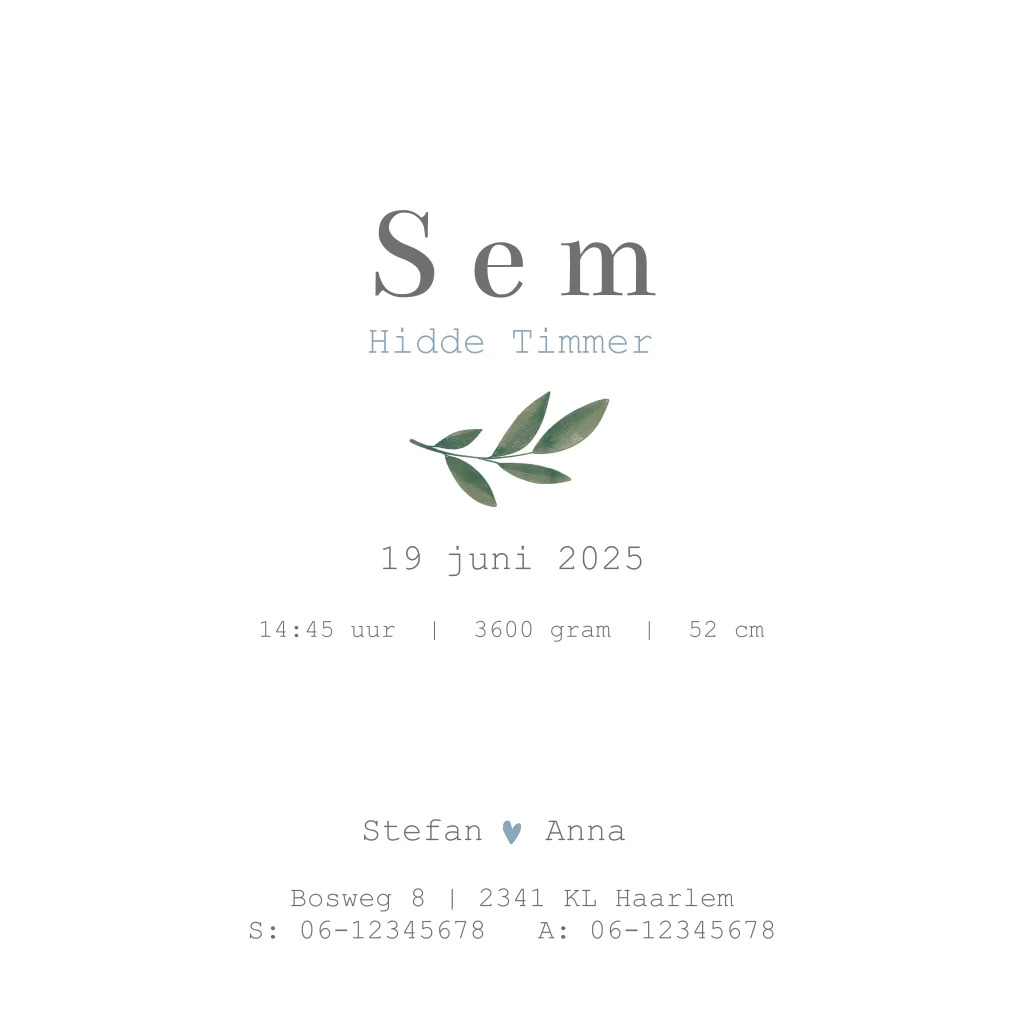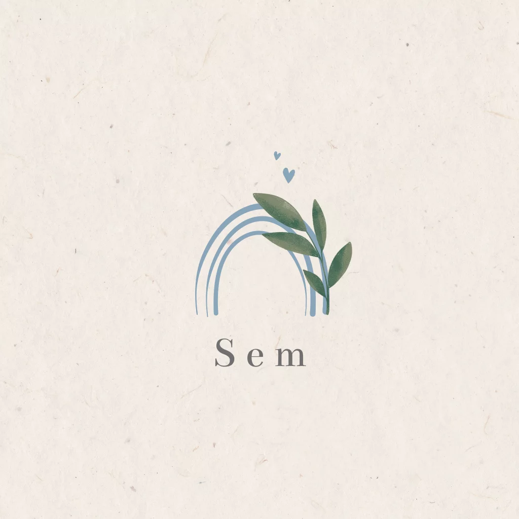Eenvoudig geboortekaartje voor een jongen met regenboog en stoer groen takje. Een origineel gedichtje op de binnenkant en mooie vezellook achtergrond.