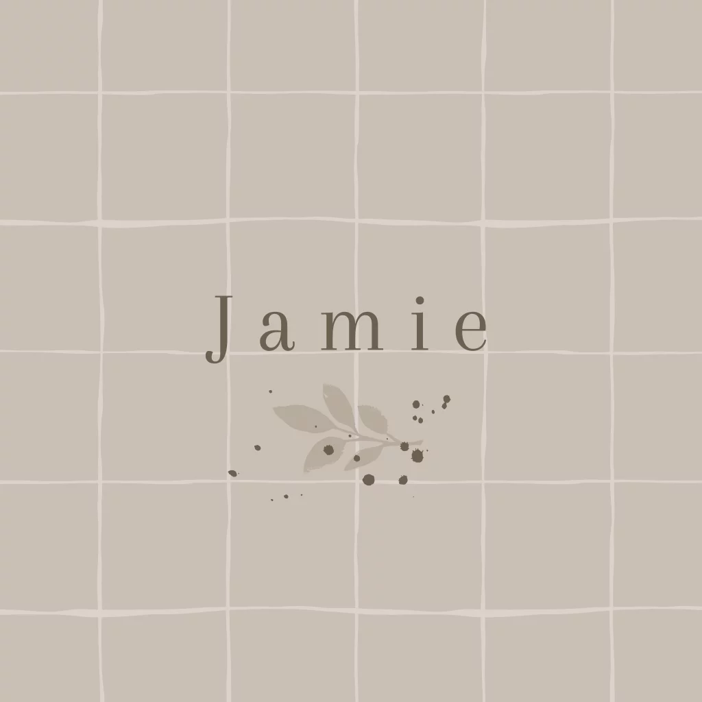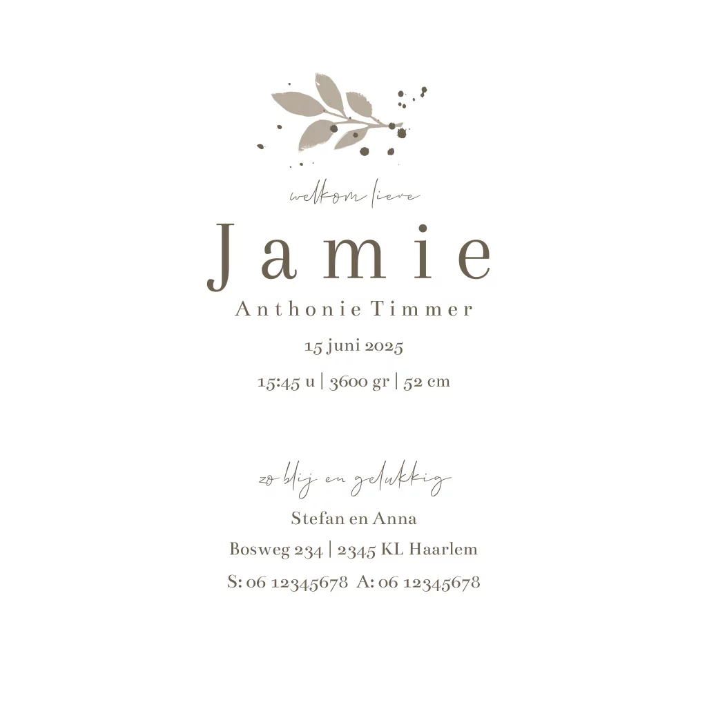 Minimalistisch geboortekaartje voor een jongen met een hip ruit patroon en een takje met spetters. In neutrale kleuren voor een stoer geboortekaartje in neutrale kleur. Je kan zelf de details en kleur online aanpassen in de ontwerptool en met illustraties uit de mappen. Mooi met een bijpassend raambord om de geboorte van jullie zoon aan te kondigen , en je kan de enveloppen vooraf bestellen.