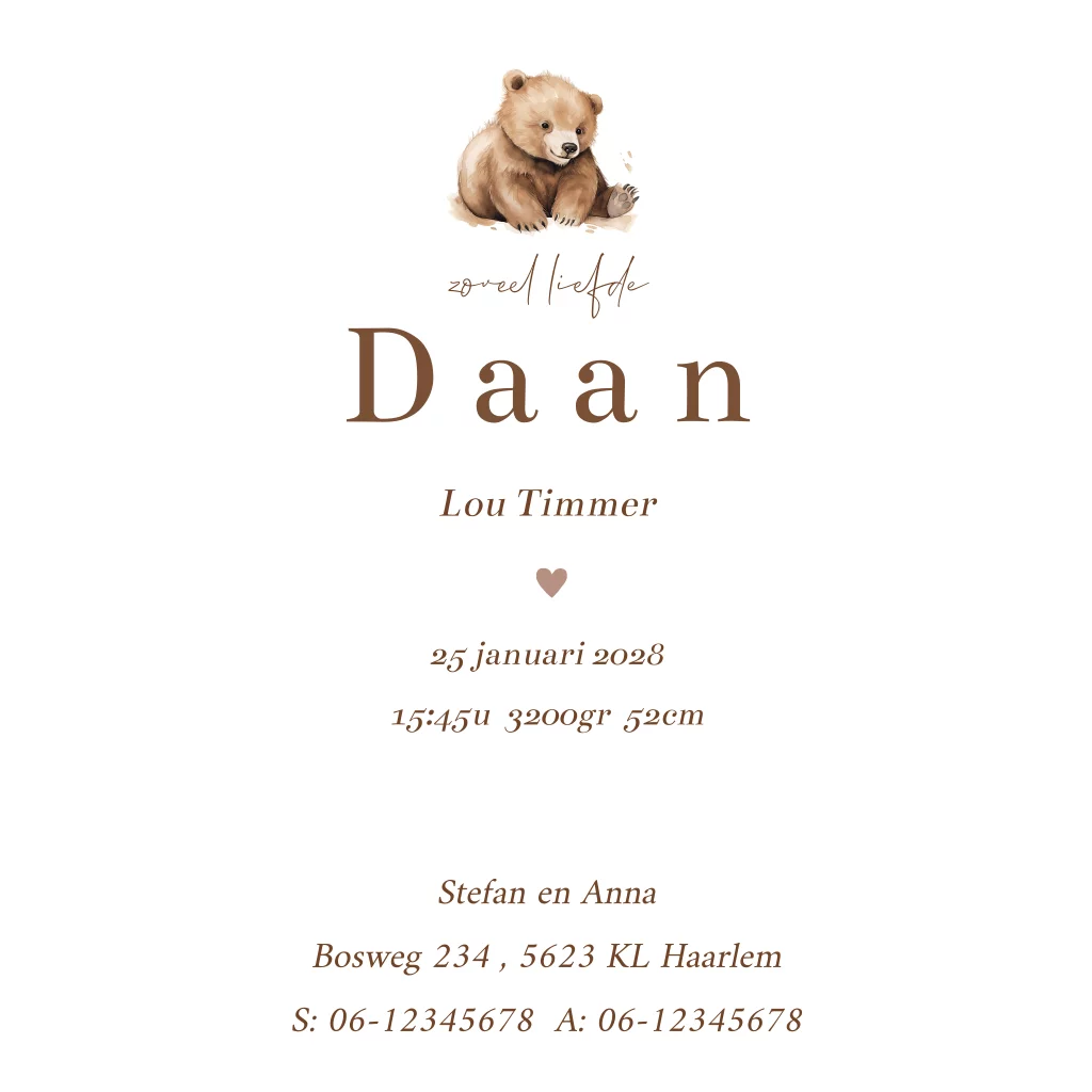 Neutraal geboortekaartje voor een jongen met mooi beertje illustratie met een zusje en broertje. Nog een extra kindje erbij ? Stuur een berichtje en wij passen het ontwerp voor je aan. Je kan eenvoudig de achtergrondkleur aanpassen. Maak de geboorteaankondiging compleet met een raambord , sluitzegel en een kraambezoekboek in de stijl van het geboortekaartje. Een leuk kraamcadeau om te vragen is een poster op canvas met latjes. Alle producten zijn eenvoudig online te bestellen.