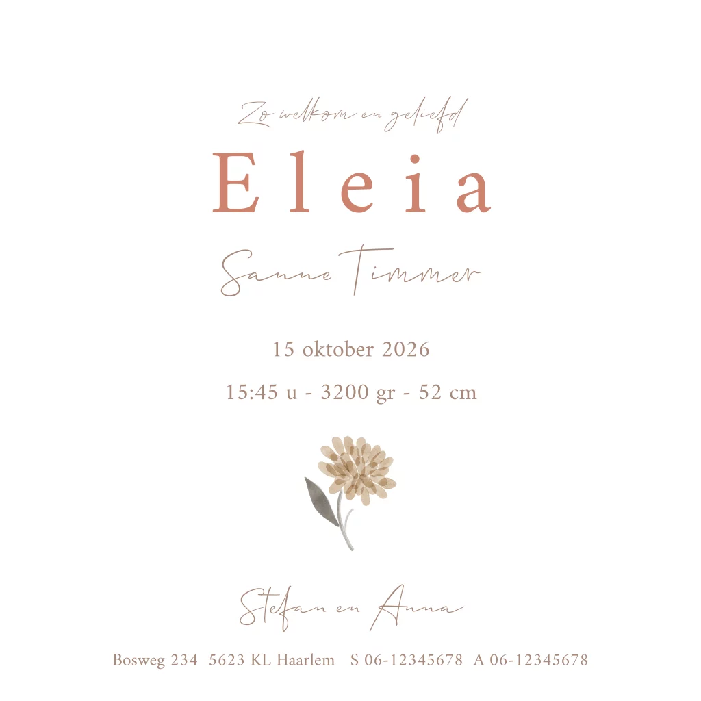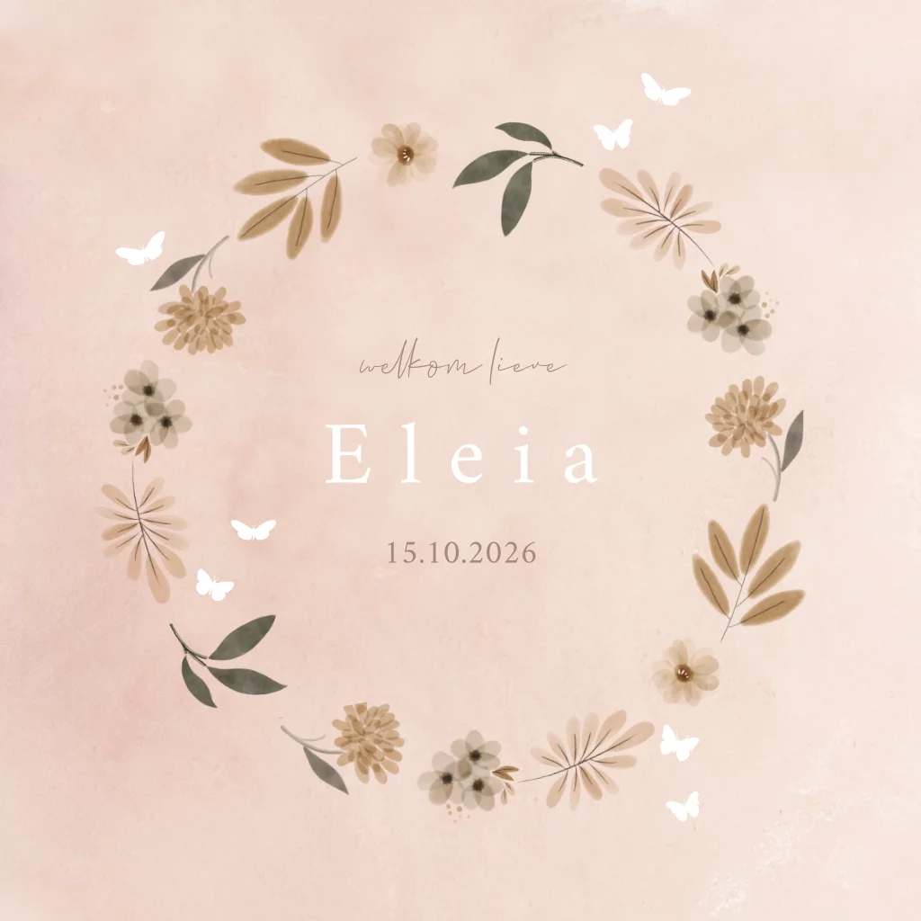 Zomers geboortekaartje voor een meisje met bloemen en vlinders. Je kan alle details eenvoudig zelf aanpassen in de online editor. Extra feestelijk verzenden met een bijpassende sluitsticker en kondig de geboorte van jullie dochter aan met een mooi raambord of raamsticker !