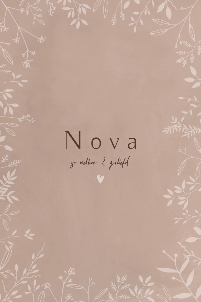 Dé trends van nu gecombineerd, een krans van takjes illustratie tegen een velour natural achtergrond. Het subtiele hartje maakt dit babykaartje voor en dochter helemaal af. Je kan de tekst zelf aanpassen.