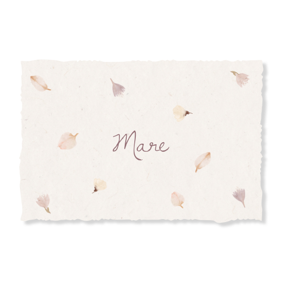 Handgeschept papier-look geboortekaartje voor een meisje met bloemen. Eenvoudig en bijzonder ! Elk geboortekaartje is uniek doordat je zelf met een speciaal liniaal de randen scheurt voor de handgeschepte look. Lees de onderstaande tips om het beste resultaat te bereiken.