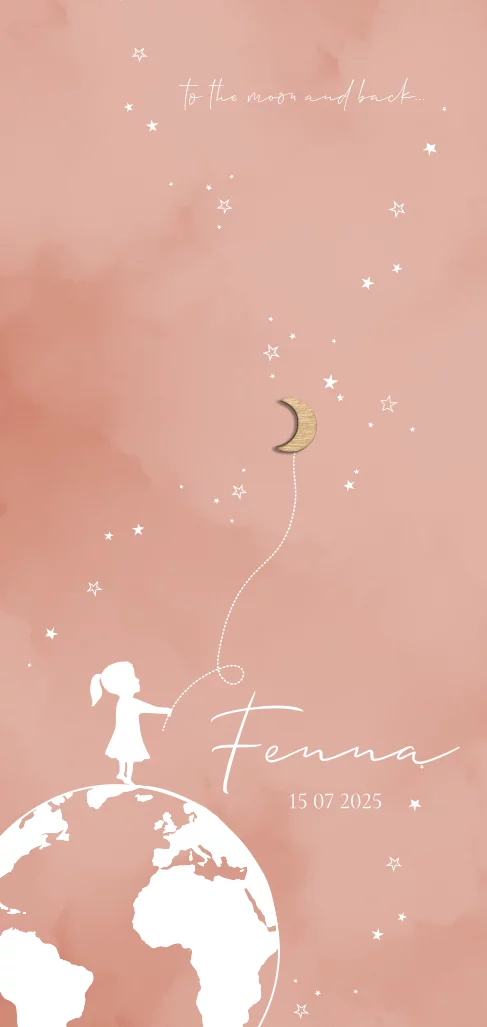 De warme natural trendkleur past mooi bij het echte hout maantje en is weer eens wat anders dan roze:) Lief en origineel met het silhouet van een meisje op de wereldbol. Let op: het maantje wordt niet afgedrukt ! Je kan een proefzakje met houten elementjes bij de proefdruk bestellen zodat je het resultaat in het echt kan bewonderen. Bij de oplage kan je de maantjes er los bijbestellen en zelf opplakken, er zit een handige plakstrip op de achterkant van het maantje.