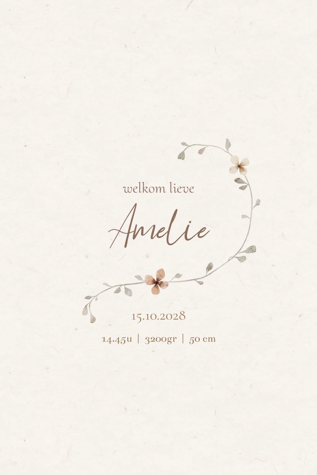 Bijzonder geboortekaartje voor een meisje met bloemen in een neutrale kleur met een zachte vezellook achtergrond. Op de achterkant kan je een babyfoto plaatsen en die ook als eerste laten zien in de insteekhoes. Het geboortekaartje en de insteekhoes zijn perfect op elkaar afgestemd. Beiden worden op mooi linnen structuur papier gedrukt.