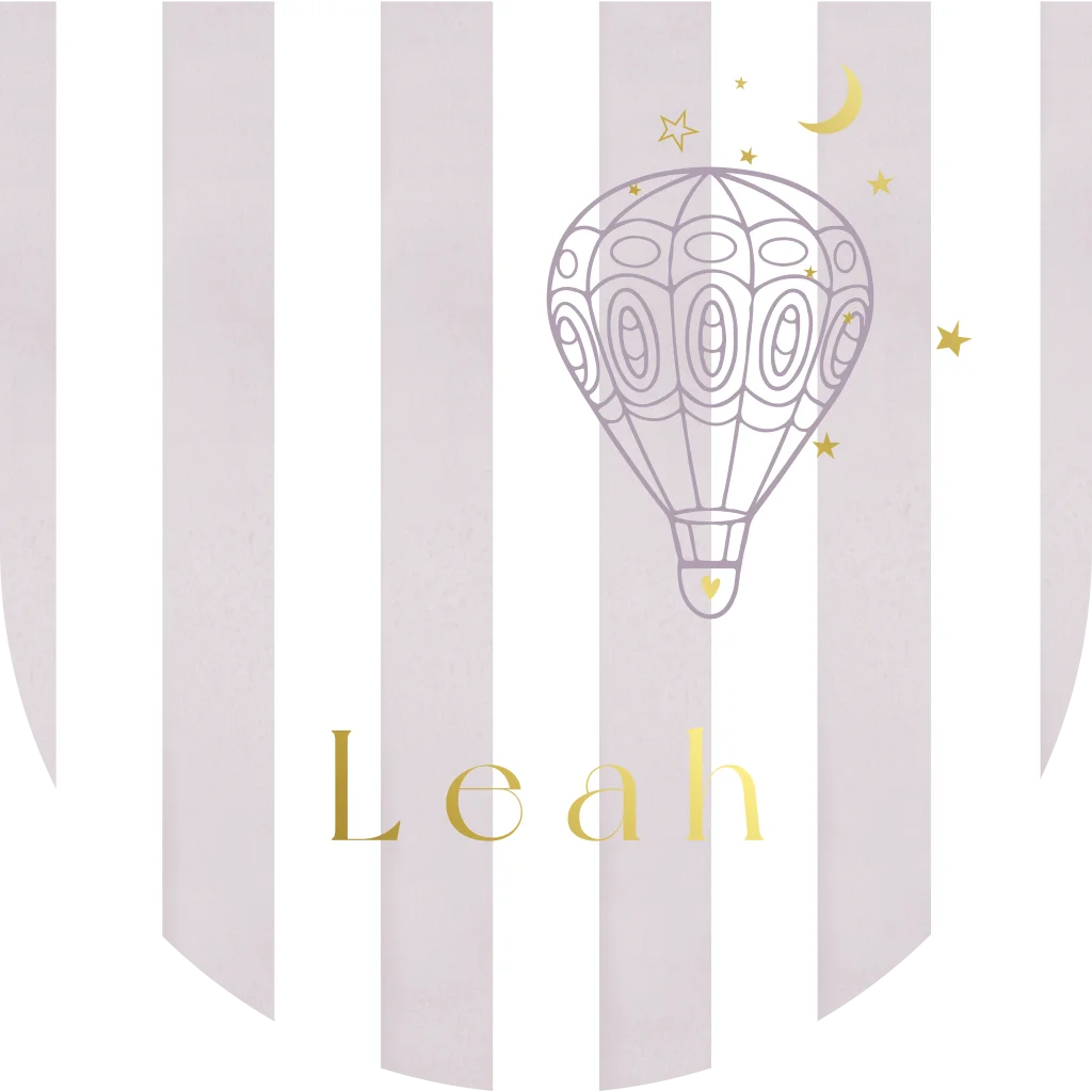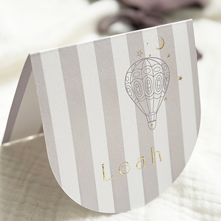 Origineel lief geboortekaartje voor een meisje met mooie luchtballon in goudfolie. De trend streepjes in een warme lila kleur maken dit kaartje extra bijzonder. Het geboortekaartje heeft een ronde staande vorm die een luxe uitstraling geeft aan dit ontwerp. Bestel van te voren een proefdruk met een sample setje zodat je het geboortekaartje in het echt kan bewonderen. Alle kleuren zijn aan te passen.