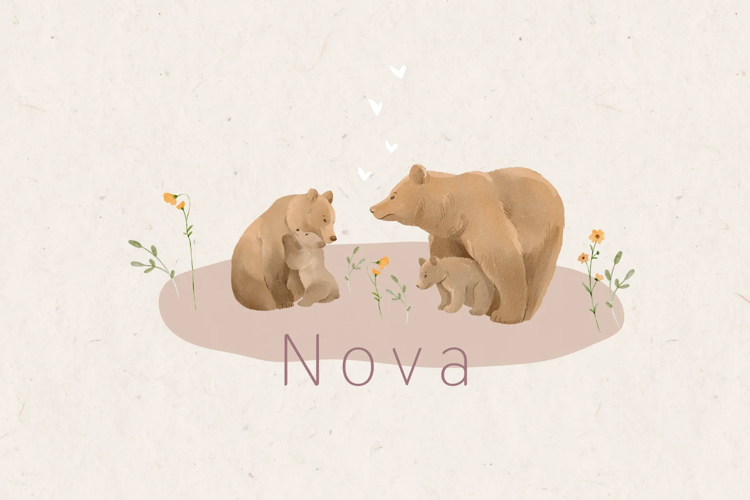 Lief geboortekaartje voor een meisje met een broertje of zusje. De familie beer maakt het geboortekaartje heel persoonlijk. In de beeldbank staan meer beren om het ontwerp mee aan te passen naar wens. Mooi met goudfolie op de vezellook achtergrond. De binnenkant is eenvoudig gehouden met hartjes en een origineel gedichtje.