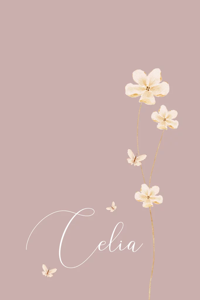 Lief geboortekaartje met bloemen en vlinders voor een meisje. Met roze achtergrond, die je eenvoudig qua kleur kan aanpassen. Op de achterkant staat een originele tekst en geboortegedichtje. De meisjesnaam staat ook mooi in rosefolie. Leuk om te combineren met een sluitzegel of maat en een geboortebord in de stijl van het geboortekaartje.