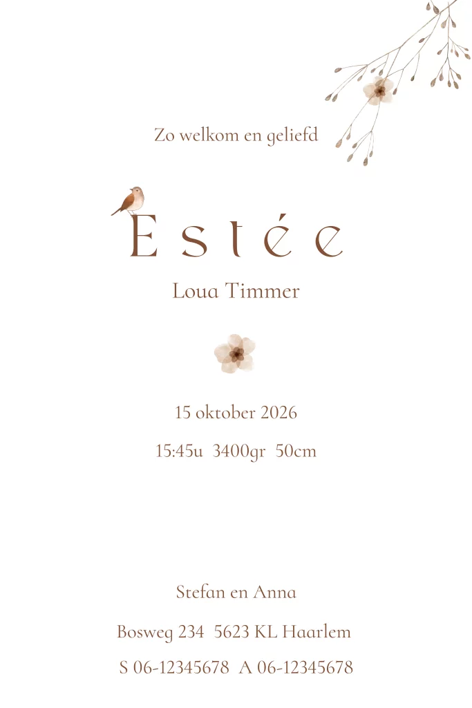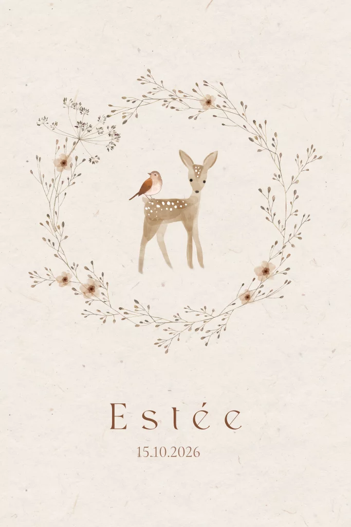 Geboortekaartje voor een meisje met een hertje en een vogeltje op een neutrale achtergrond met mooie bloemen. Lief en tijdloos. Je kan eenvoudig zelf het geboortekaartje naar wens aanpassen met een achtergrond kleur en teksten . Op de binnenkant staat een lief geboortegedichtje. Een bijpassend raambord om de geboorte van jullie meisje aan te kondigen kan je meebestellen.