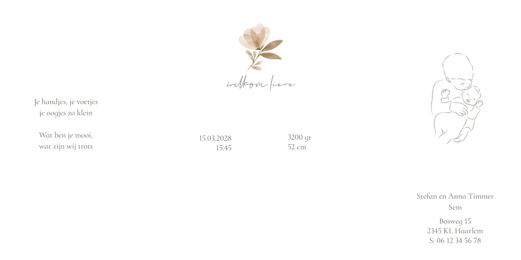 Klassiek geboortekaartje voor een meisje met linnenlook achtergrond en hartjes in goudfolie. Heel mooi te sluiten met een zijden lint strikje. Alle details zijn aan te passen in de editor. Met een lieve tekst op de voorkant en een lijntekening van een broertje met zusje en een geboortegedichtje op de binnenkant. De goudfolie details geven een extra luxe uitstraling aan dit geboortekaartje.