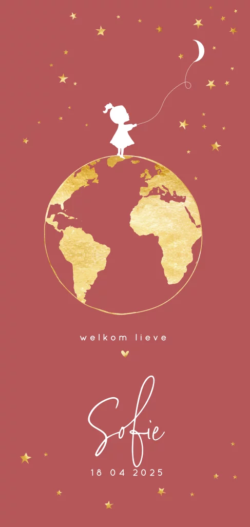 Het geboortekaartje heeft een warme rode kleur die past mooi bij de goudkleur (geen folie). De wereldbol in goudkleur en het silhouet van een meisje is origineel met de maan. Wil je er een broertje of zusje bij plaatsen ? Die staan klaar in de illustratie map en zijn eenvoudig toe te voegen. Lief met hartjes en sterretjes. Wil je liever echte folie, kijk dan bij de foliedruk collectie !