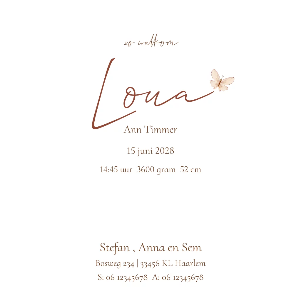 Lief zomers geboortekaartje voor een meisje met vlinders. De vezellook achtergrond geeft een mooie naturel uitstraling. Je kan de gegevens aanpassen en zo zelf je geboortekaartje ontwerpen. Liever met folie ? Dat is eenvoudig aan te passen met onze editor. Maak de geboorte aankondiging compleet met een raambord in dezelfde stijl als het babykaartje