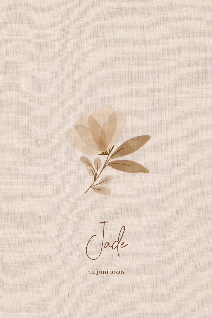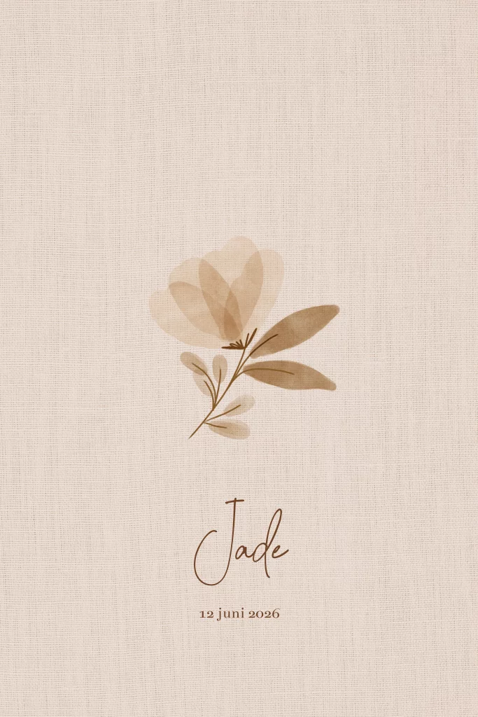 Klassiek geboortekaartje voor een meisje met een mooie linnen achtergrond en lieve bloem illustratie. Liever goudfolie ? dat kan je eenvoudig aanpassen in de ontwerptool. Je kan een bijpassend raambord en een kraambezoekboek in dezelfde stijl bestellen. De envelop versier je extra mooi met een sluitzegel.