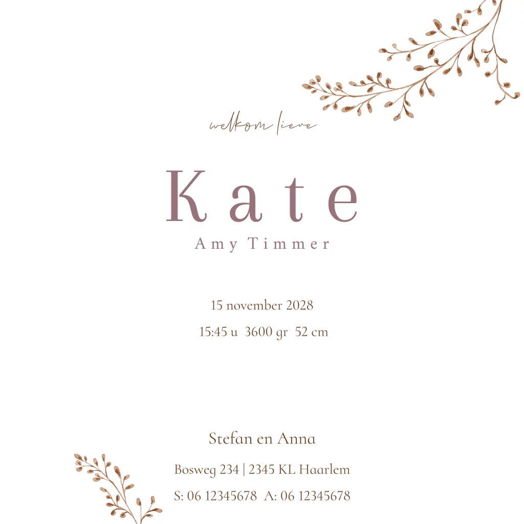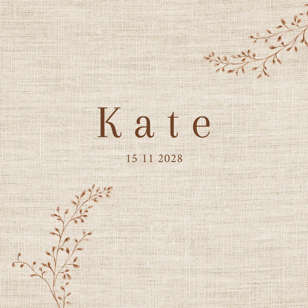 Minimalistisch klassiek geboortekaartje voor een meisje met linnen en bloemen. Mooi met een vogeltje en een lief gedichtje op de binnenkant. Je kan zelf de details en goudfolie toevoegen in de ontwerptool en met illustraties uit de mappen.