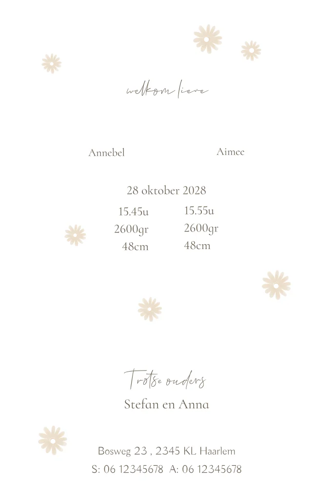 Een origineel geboortekaartje voor tweeling meisjes met goudfolie naam en bloemen. De linnen achtergrond geeft een luxe klassieke uitstraling aan dit lieve geboortekaartje. Je kan een bijpassend raambord, raamvlag, kraamfeest boek, sluitstickers, poster in dezelfde stijl bestellen.
