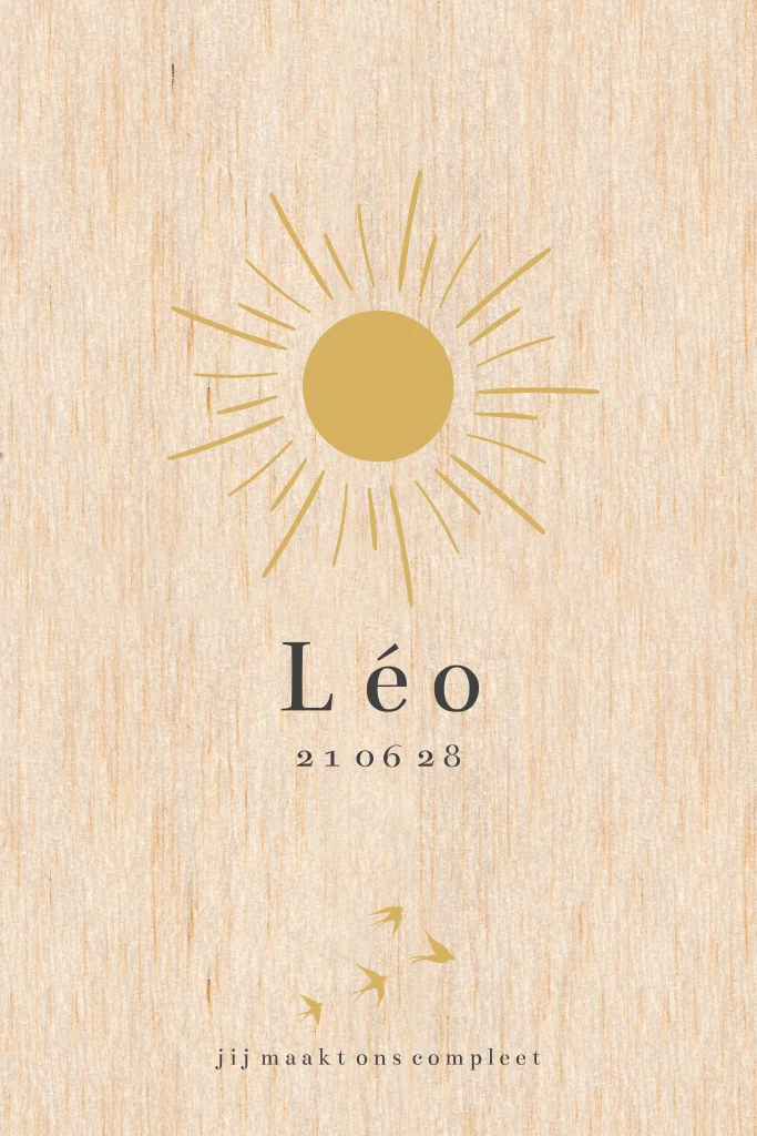 Bijzonder geboortekaartje voor een jongen met de zon en zwaluwen op echt berkenhout , origineel ! Ontwerp | Léo