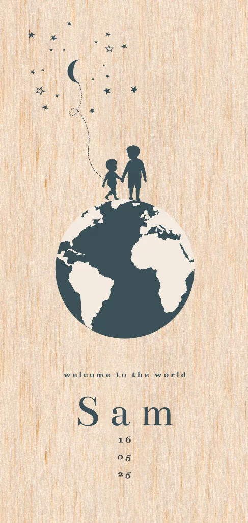Geboortekaartje silhouet broertje op wereldbol met sterrenhemel op echt hout. Goed om te weten: • Elk kaartje is verschillend omdat hout een natuurlijk product is. • Het is technisch niet mogelijk om wit te drukken, gebruik dus geen wit. • Dit formaat houten kaartje heeft meestal 1 postzegel nodig, maar weeg jouw envelop zelf na! Heb je vragen of hulp nodig, stuur gerust een berichtje!
