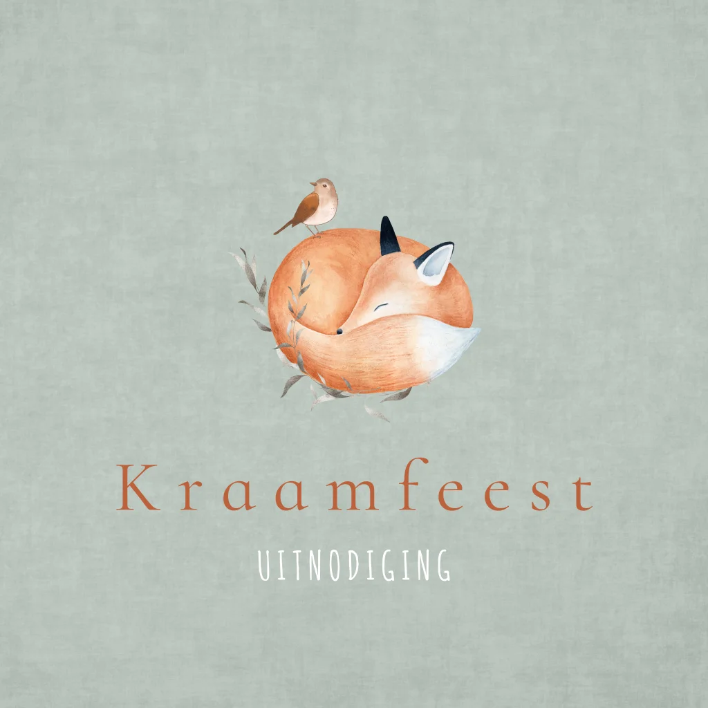 Kraamfeest uitnodiging voor een jongen passend bij het geboortekaartje met een vosje en vogeltje. superlief. De teksten en details zijn eenvoudig zelf aan te passen. leuk te combineren met een druppelclip aan het geboortekaartje