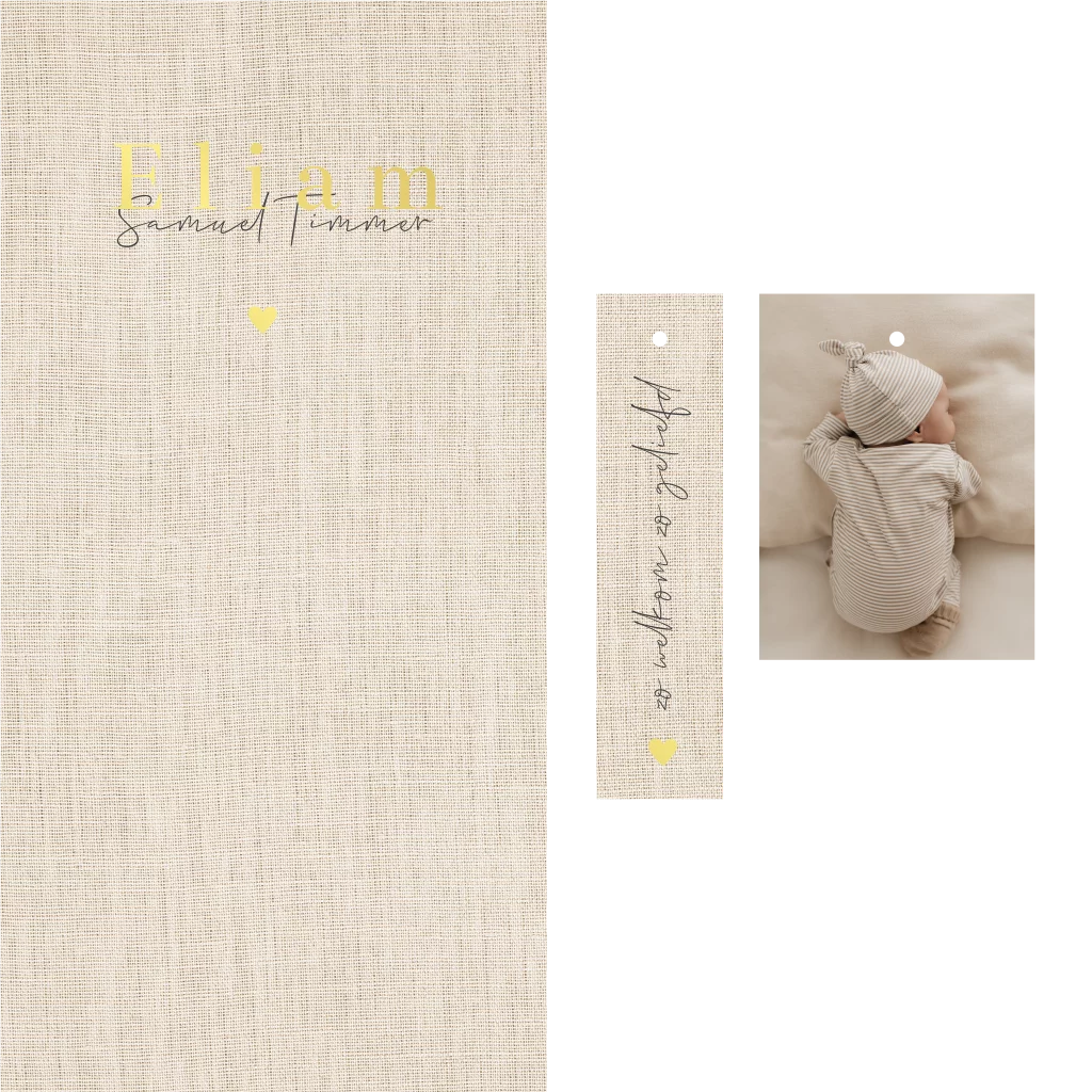 Minimalistisch stoer geboortekaartje voor een jongen met goudfolie. Met twee labeltjes, een tekst labeltje en een label voor een babyfoto. De linnenlook achtergrond geeft een luxe klassieke uitstraling aan het kaartje.
