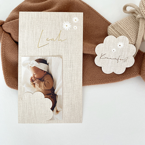 Lief label insteek geboortekaartje voor een meisje met babyfoto label en linnen achtergrond, goudfolie babynaam en bloemetjes. Je kan de foto in het geboortekaartje steken in de bloem inkeping. En als extra een kraamfeest uitnodiging kaartje voor de achterkant. Liever een andere kleur? Alle details zijn heel eenvoudig in de editor aan te passen.
