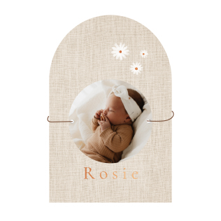 Lief neutraal label geboortekaartje voor een meisje met babyfoto label en linnen achtergrond, rosefolie babynaam en een madeliefjes. Met twee labelkaartjes om aan elkaar te bevestigen met een touwtje. De trend neutrale achtergrond kleur geeft een mooie uitstraling aan het babykaartje . Liever een andere kleur? Alle details zijn heel eenvoudig in de editor aan te passen.