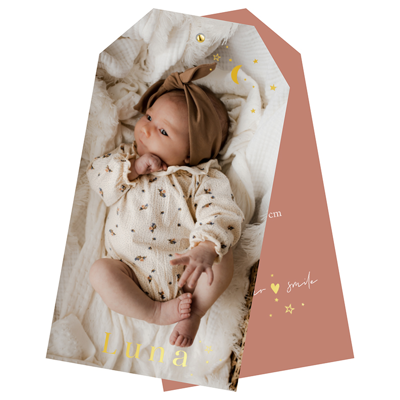 Dit bijzondere lieve labelkaartje voor een meisje met een babyfoto krijgt een extra luxe uitstraling door de goudfolie sterretjes en naam. Je kan de foliekleur en de achtergrondkleur eenvoudig zelf aanpassen in de online editor.