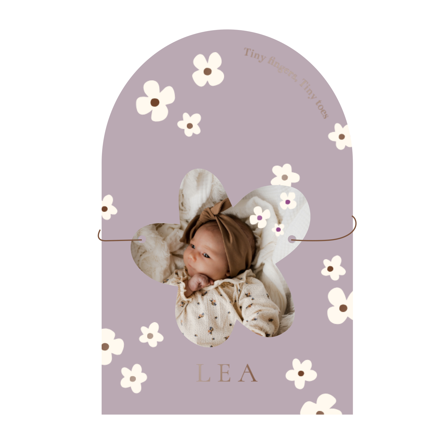 Lief label geboortekaartje voor een meisje met bloemen en hoogglans folie babynaam en stripjes. Met twee labelkaartjes om aan elkaar te bevestigen met een touwtje. De trendkleur lila achtergrond geeft een vrolijke uitstraling aan het babykaartje . Liever een andere kleur? Alle details zijn heel eenvoudig in de editor aan te passen.