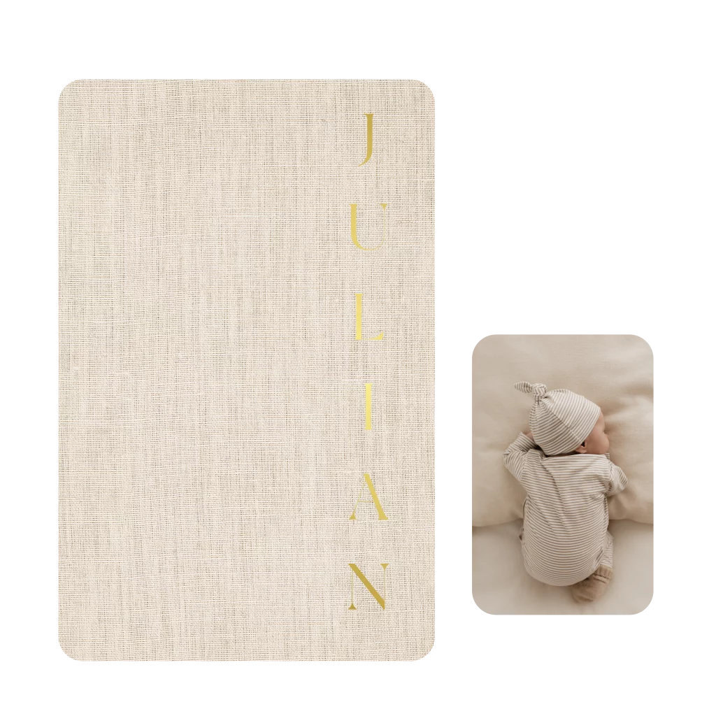 Minimalistisch stoer geboortekaartje voor een jongen met linnen en goudfolie. Op het losse labeltje de mooie babyfoto van jullie zoon.