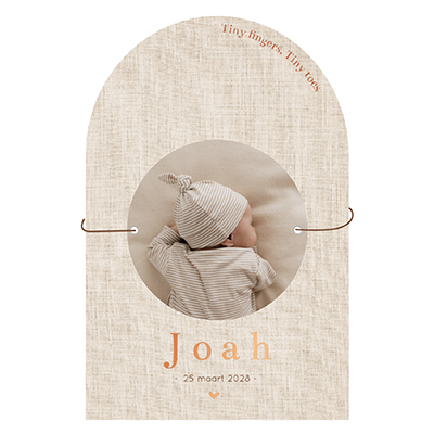 Lief label geboortekaartje voor een jongen met babyfoto label en linnen achtergrond, hoogglans folie in koperkleur babynaam en een hartje. Met twee labelkaartjes om aan elkaar te bevestigen met een touwtje. De trend neutrale achtergrond kleur geeft een mooie uitstraling aan het babykaartje . Liever een andere kleur? Alle details zijn heel eenvoudig in de editor aan te passen.