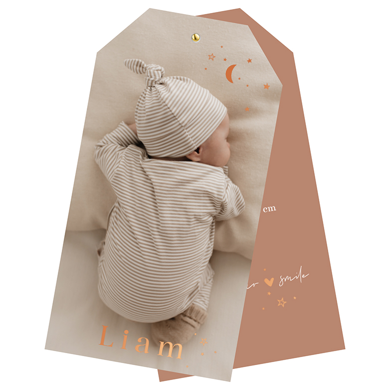 Dit bijzondere labelkaartje voor een jongen met een babyfoto krijgt een extra luxe uitstraling door de hoogglans folie in koperkleur sterretjes en naam. Je kan de foliekleur en de achtergrondkleur eenvoudig zelf aanpassen in de online editor.