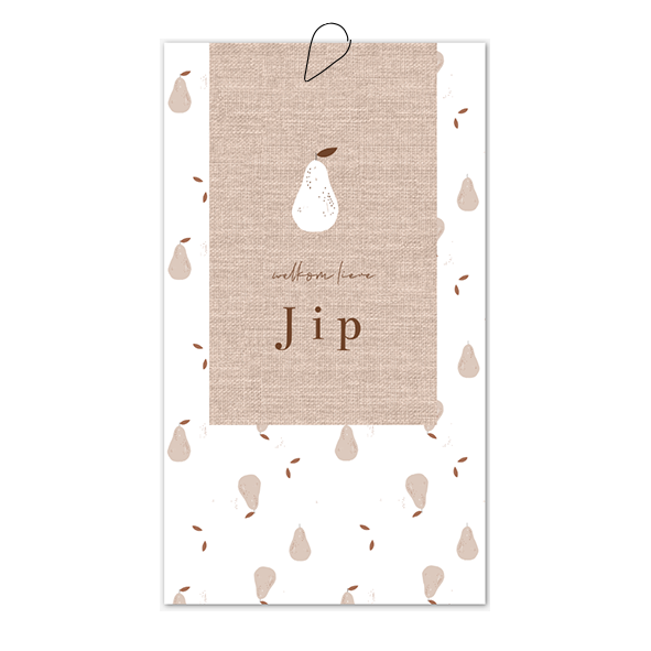 Trendy en stoer geboortekaartje voor een jongen met te leuke peren patroon. Met twee labelkaartjes om aan elkaar te bevestigen met een clipje. De linnenlook achtergrond geeft een luxe klassieke uitstraling aan het kaartje.